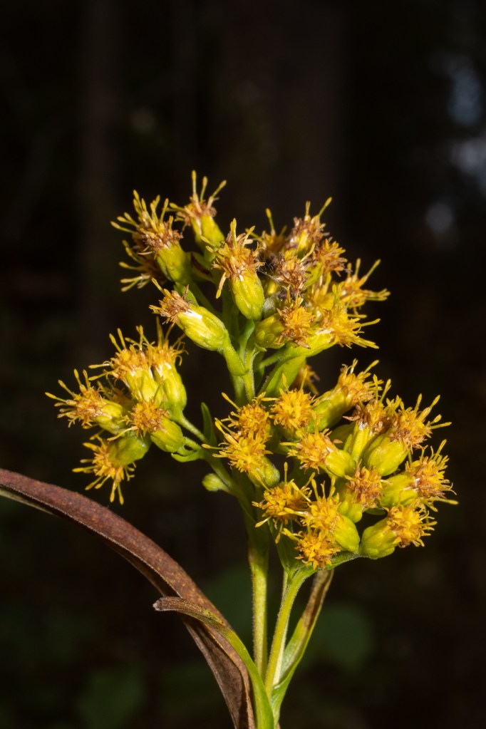 Blue stemmed goldenrod (Solidago caesia), unlike many of the other species of goldenrod which occur in Michigan, thrive in shady areas. This plant occurs in woodlands and the inflorescences appear in bunches along the stem in the axils of each leaf. It is an important fall food source for woodland pollinators.